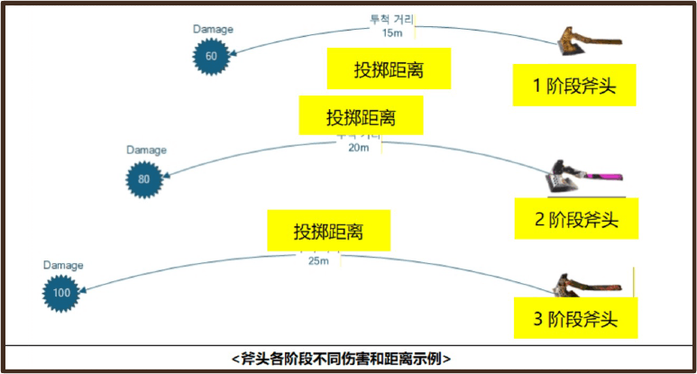 共设3个斧头阶段,阶段越高,左键投掷的伤害、距离越强,右键重击伤害全阶段保持一致。