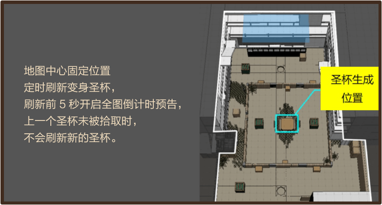 地图中心固定位置定时刷新变身圣杯,刷新前5秒开启全图倒计时预告,上一个圣杯未被拾取时,不会刷新新的圣杯。